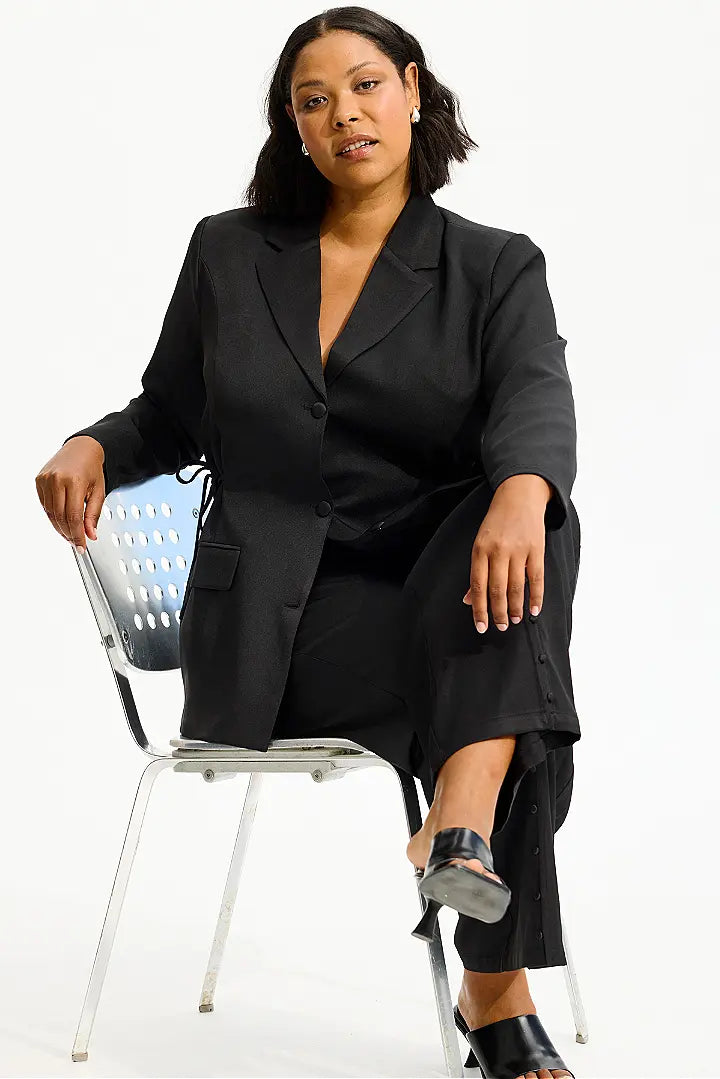 Trendikäs laatikkomainen bleiseri, jossa upeana yksityiskohtana kiristysnyörit sivuilla, jotka saa solmittua rusetille. Taskut. 97% polyester, 3% elastaani, vuori 100& polyester.