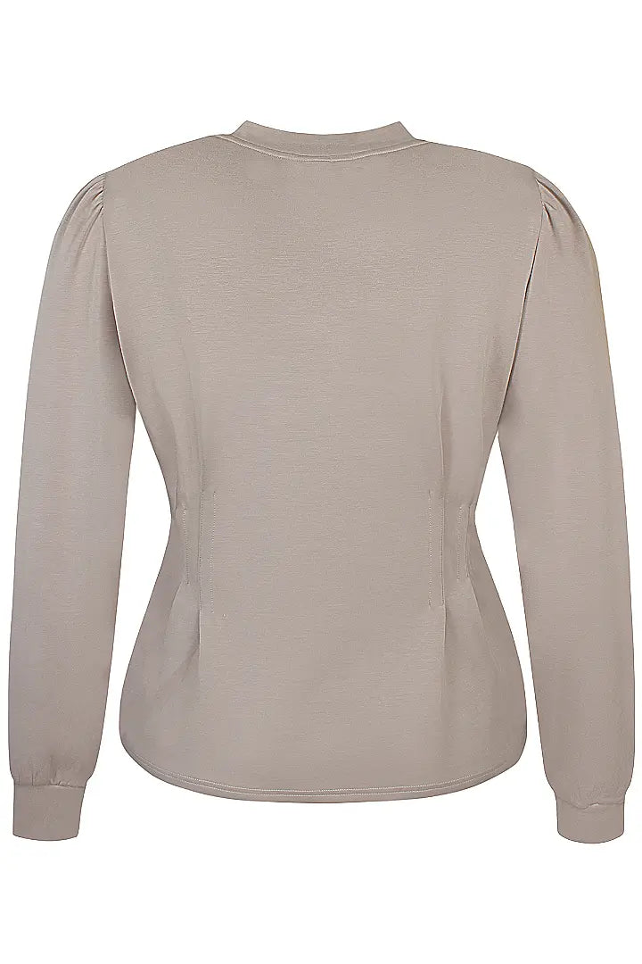 Liukaspintainen ohuehko collegepusero, pienellä puhvimaisella rypytyksellä olkapäissä, sekä hoikentavilla muotolaskoksilla vyötäröllä. Väri Chateau, luonnossa väri suunnilleen tuotekuvan ja kuvan mallin päällä välimaastosta! 50% polyester, 45% viskoosi, 5% elastaani.