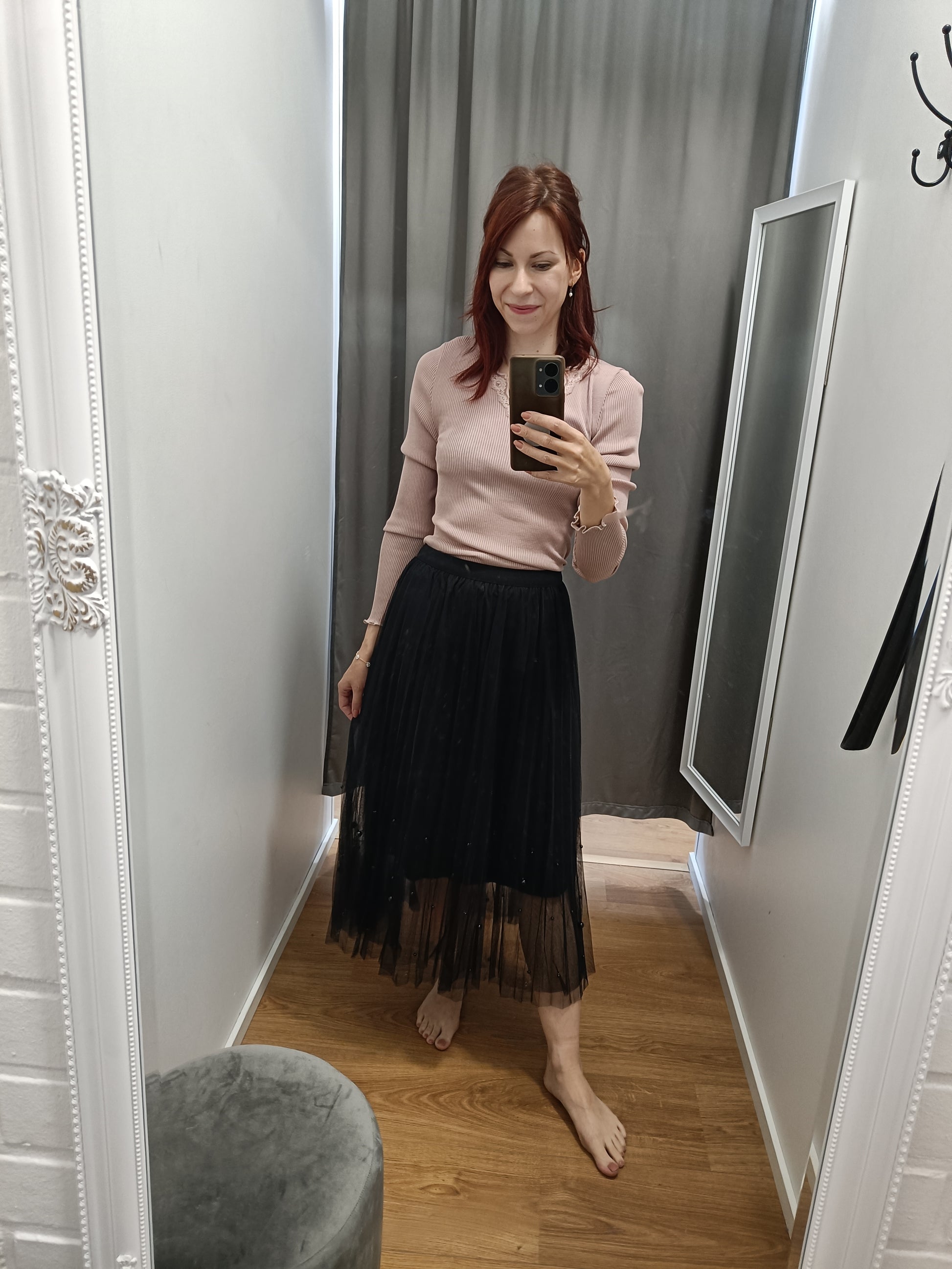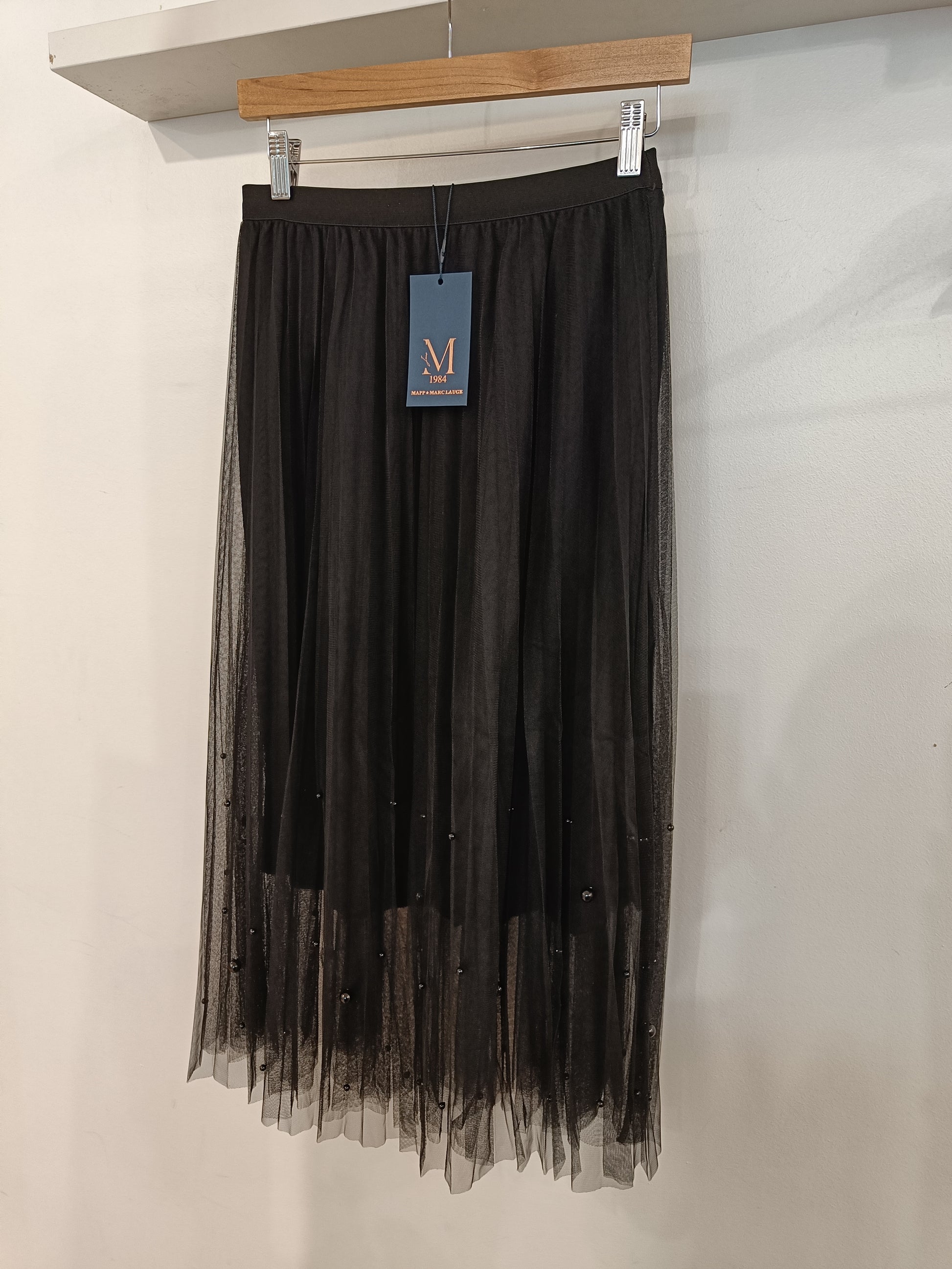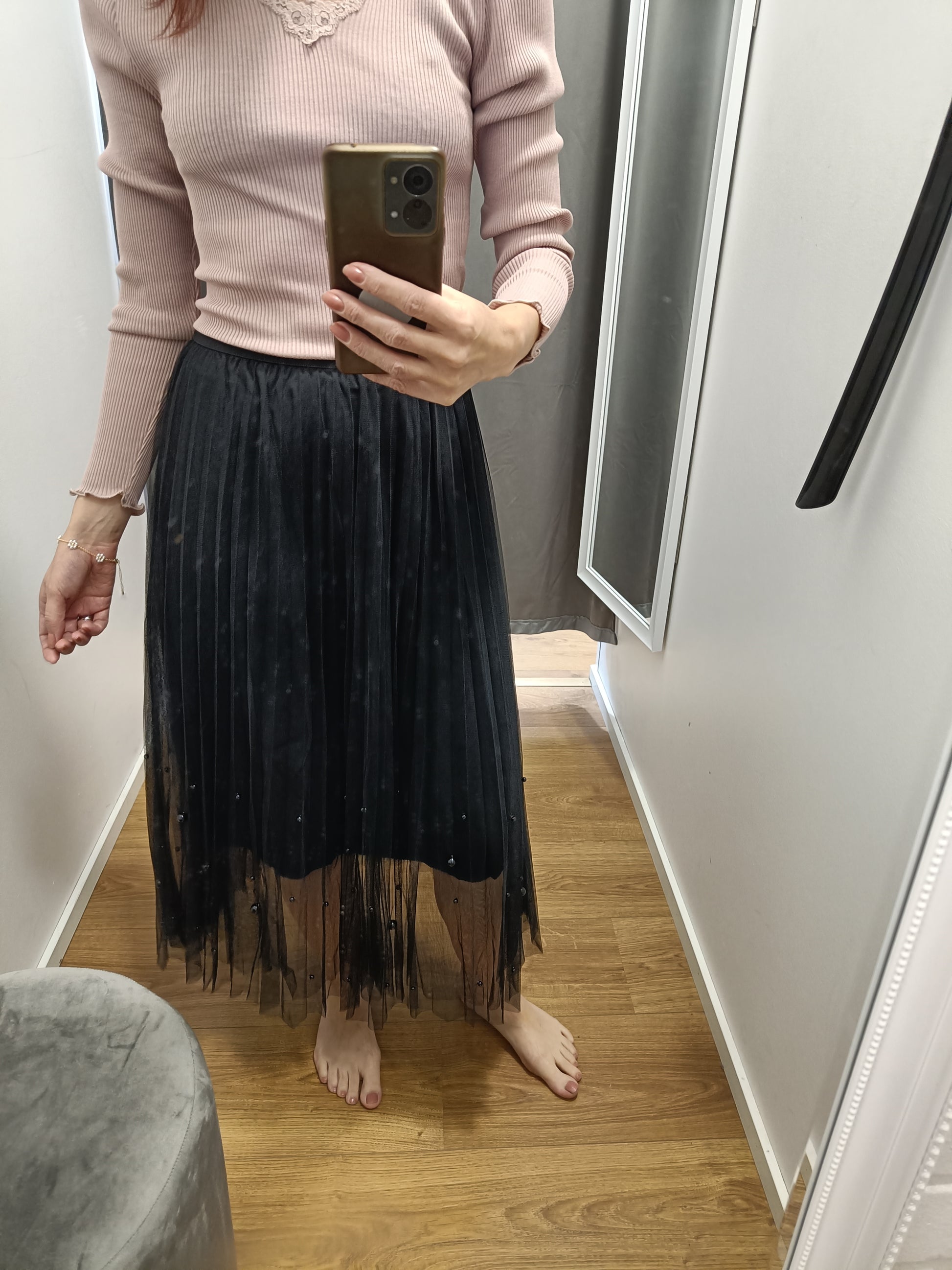 Upea musta tyllihame kiiltävän mustilla pienillä ja isoilla helmillä! Alushame/vuori ulottuu n. polven korkeudelle. Kuminauha vyötärö. 100% polyester. Pue esim. nahkatakki tai oversize-farkkutakki kaveriksi!
