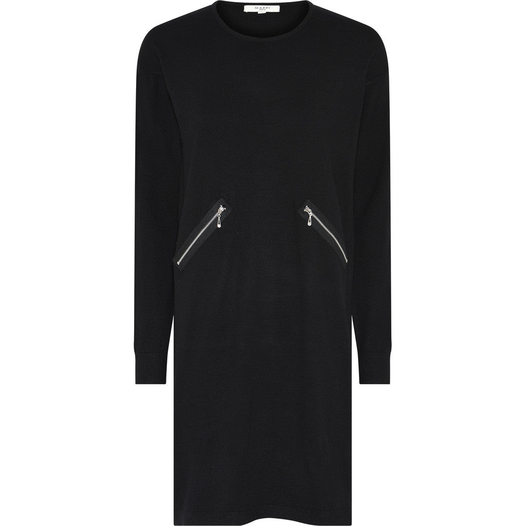 Neulemekko, 52% viskoosi, 26% polyester, 22% nylon. Edessä koristeena vetoketjut/valetaskut. Olka-helma n. 91cm.