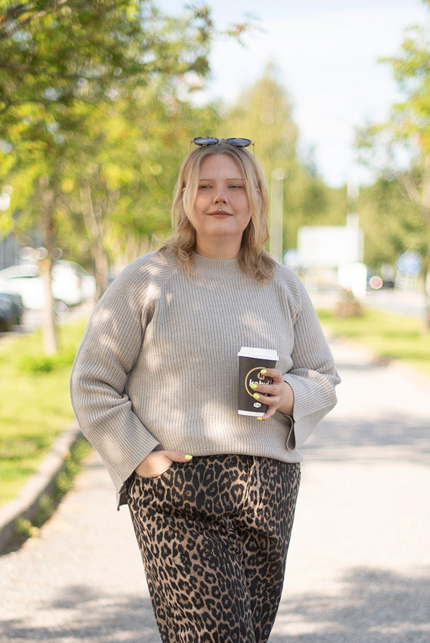 Neulepusero värissä light sand melange 50% puuvilla 50% akryyli. Leveähkö raglanhiha. Laatikkomainen malli ja pienet halkiot sivuilla.
