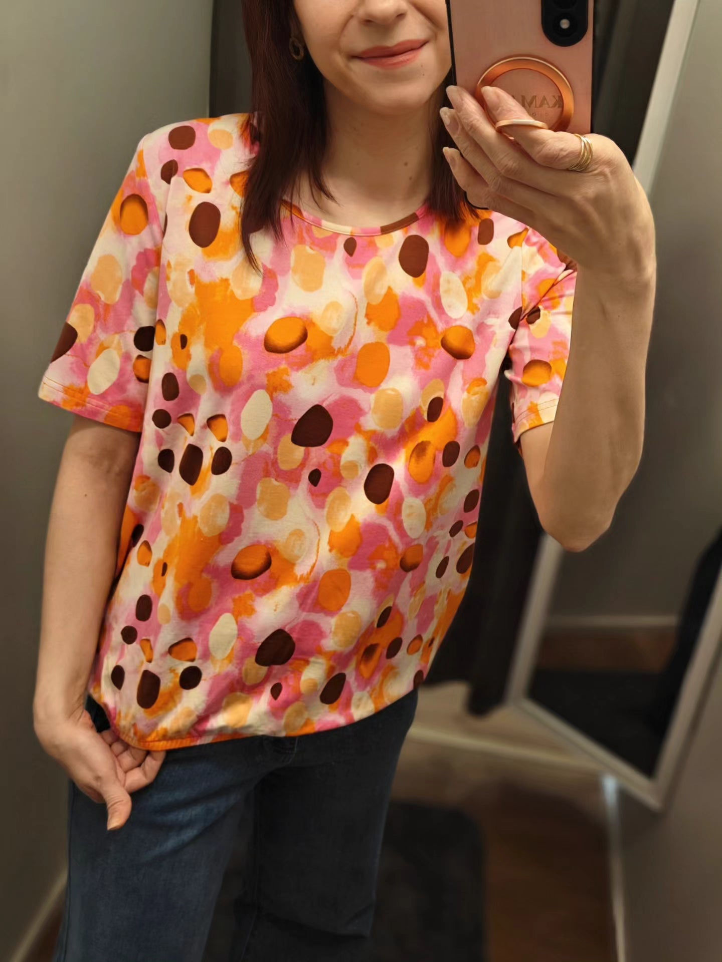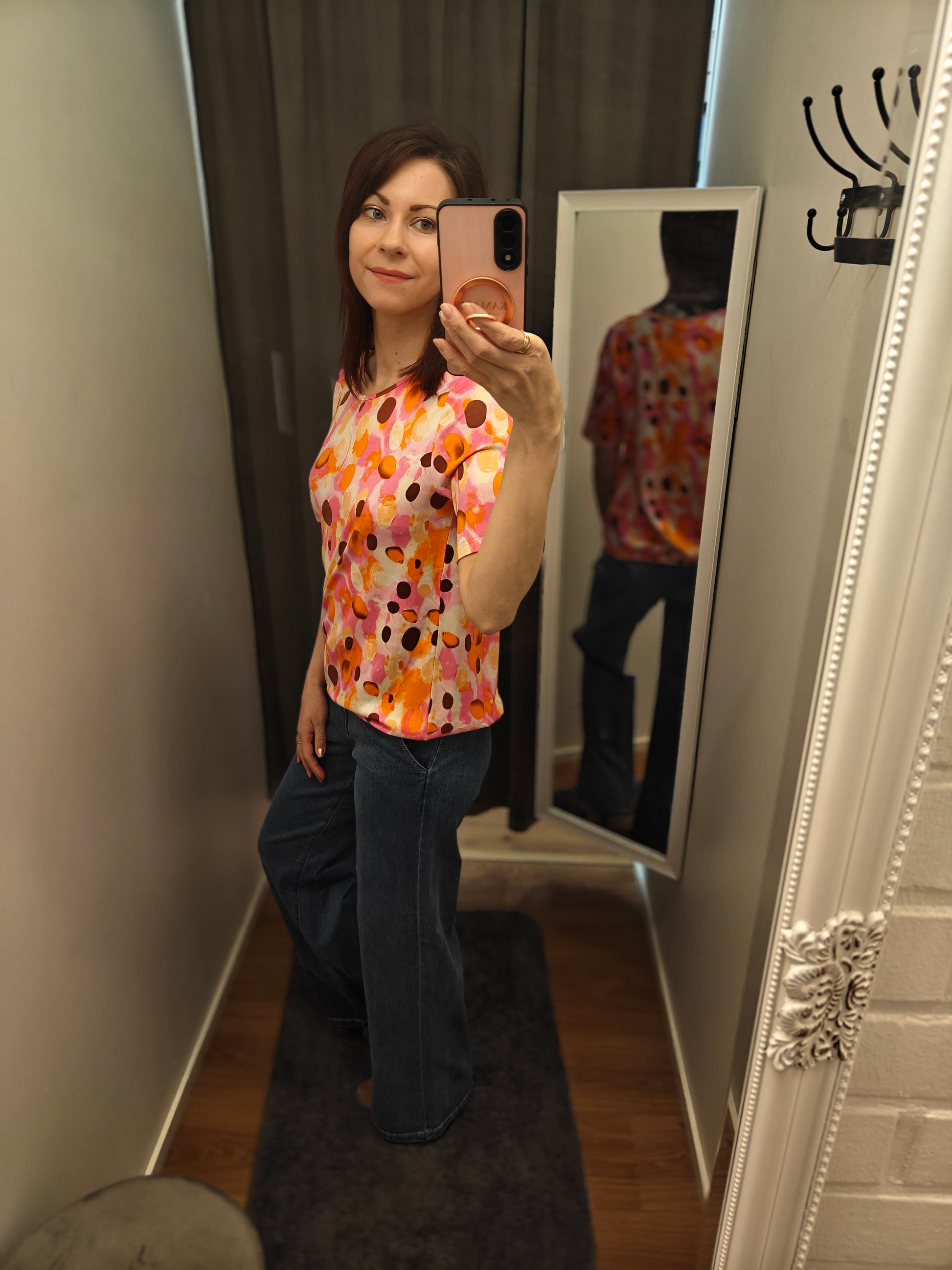 Upeat kirkkaat värit mukavassa lyhthihaisessa trikoopuserossa. Helmassa kuminauha. Kainalo-kainalo-mitat otettu venyttämättä.