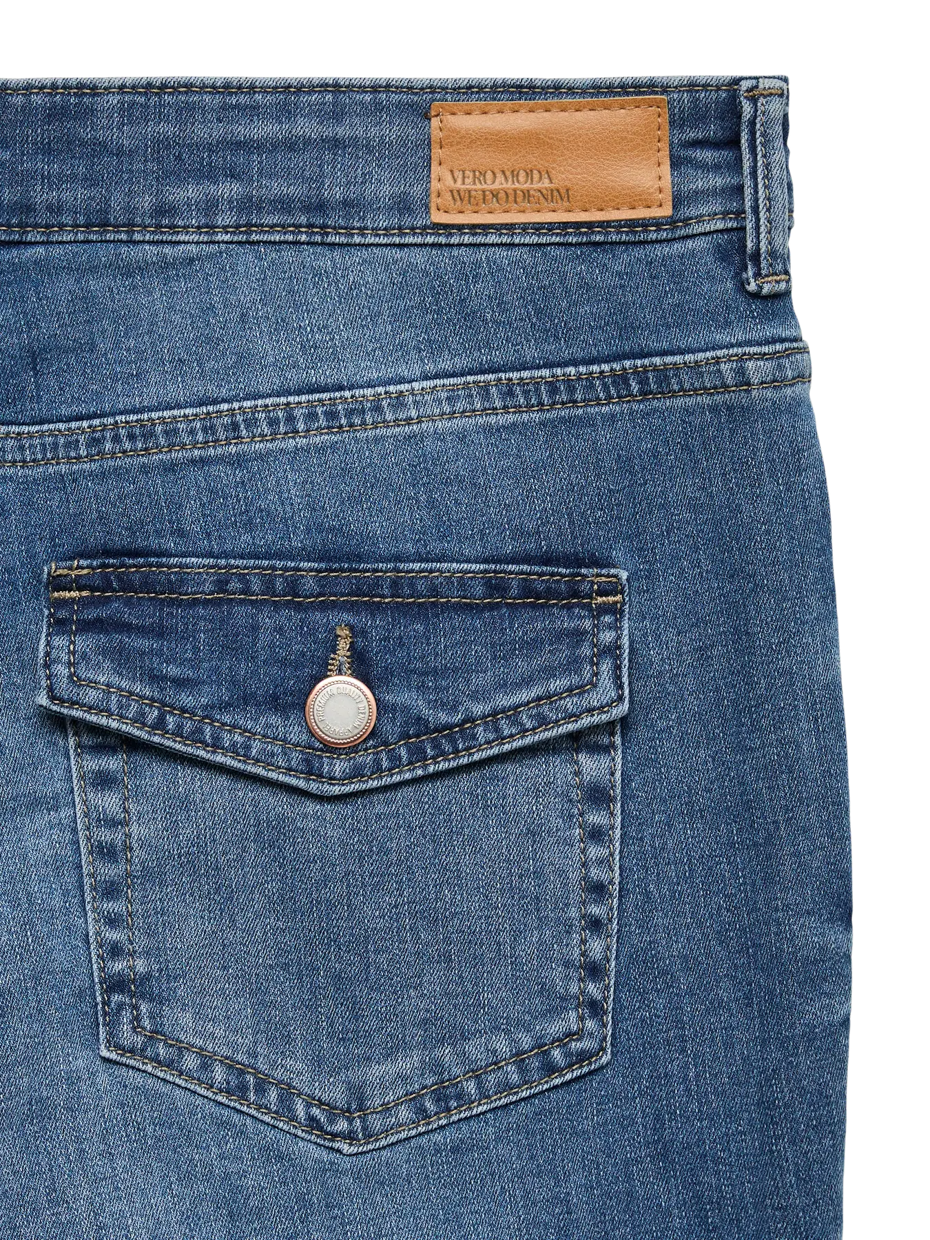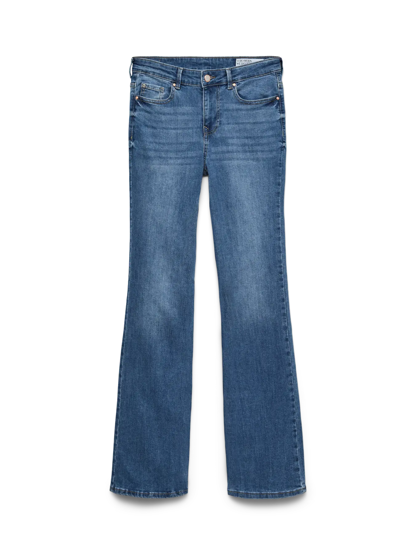 Flared-lahkeinen trendikäs farkku napillisilla takataskuilla! Väri medium blue denim.