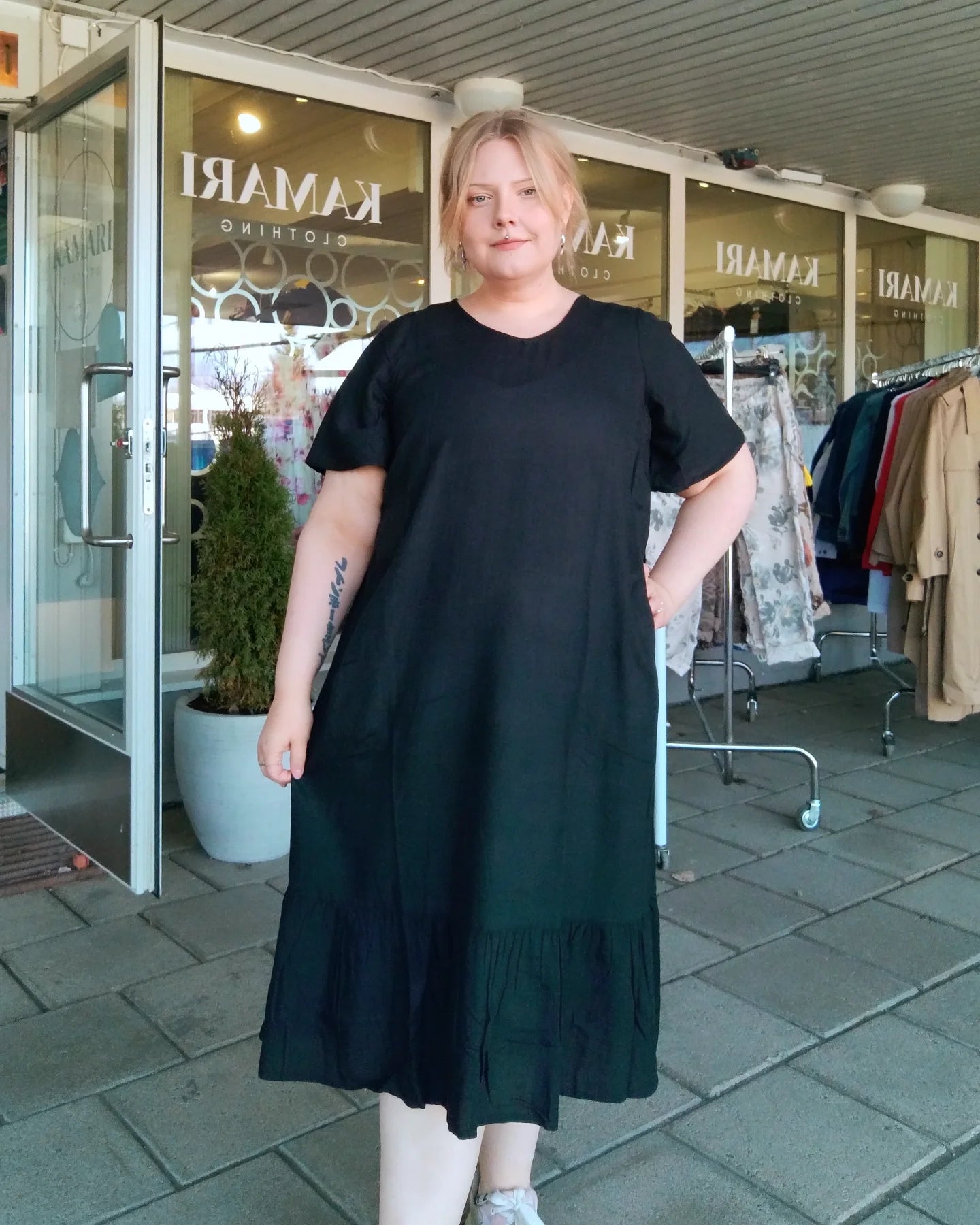 Musta kevyt pellavasekoitemekko, frilla helmassa. Taskut! 20% pellava, 50% viskoosi, 30% puuvilla.